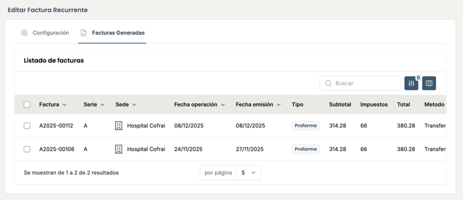 Una vez tengas configurada una factura recurrente, podrás fácilmente ver todas las facturas que se generaron a partir de ella en la pestaña de "Facturas Generadas" en la vista de la factura recurrente.