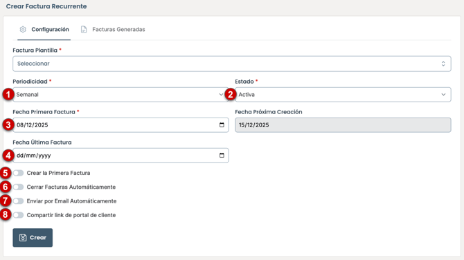 - Fecha de la última factura → opcional - si se deja vacío, se crearán facturas indefinidamente